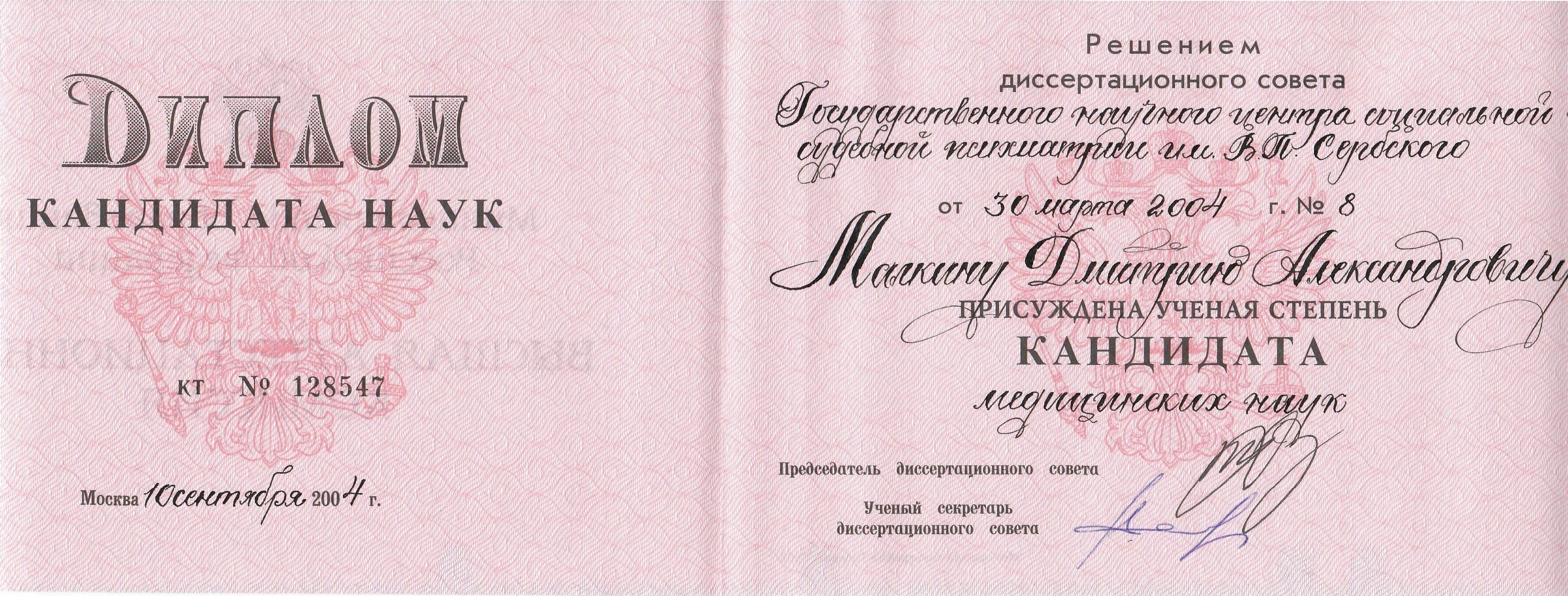 В 2000г. поступил в очную аспирантуру по психиатрии ГНЦССП им. В.П.Сербского. В 2004г. успешно защитил кандидатскую диссертацию по теме: «Экспертная оценка психического состояния лиц, совершивших сделки в рамках комплексной судебной психолого-психиатрической экспертизы», является кандидатом медицинских наук.