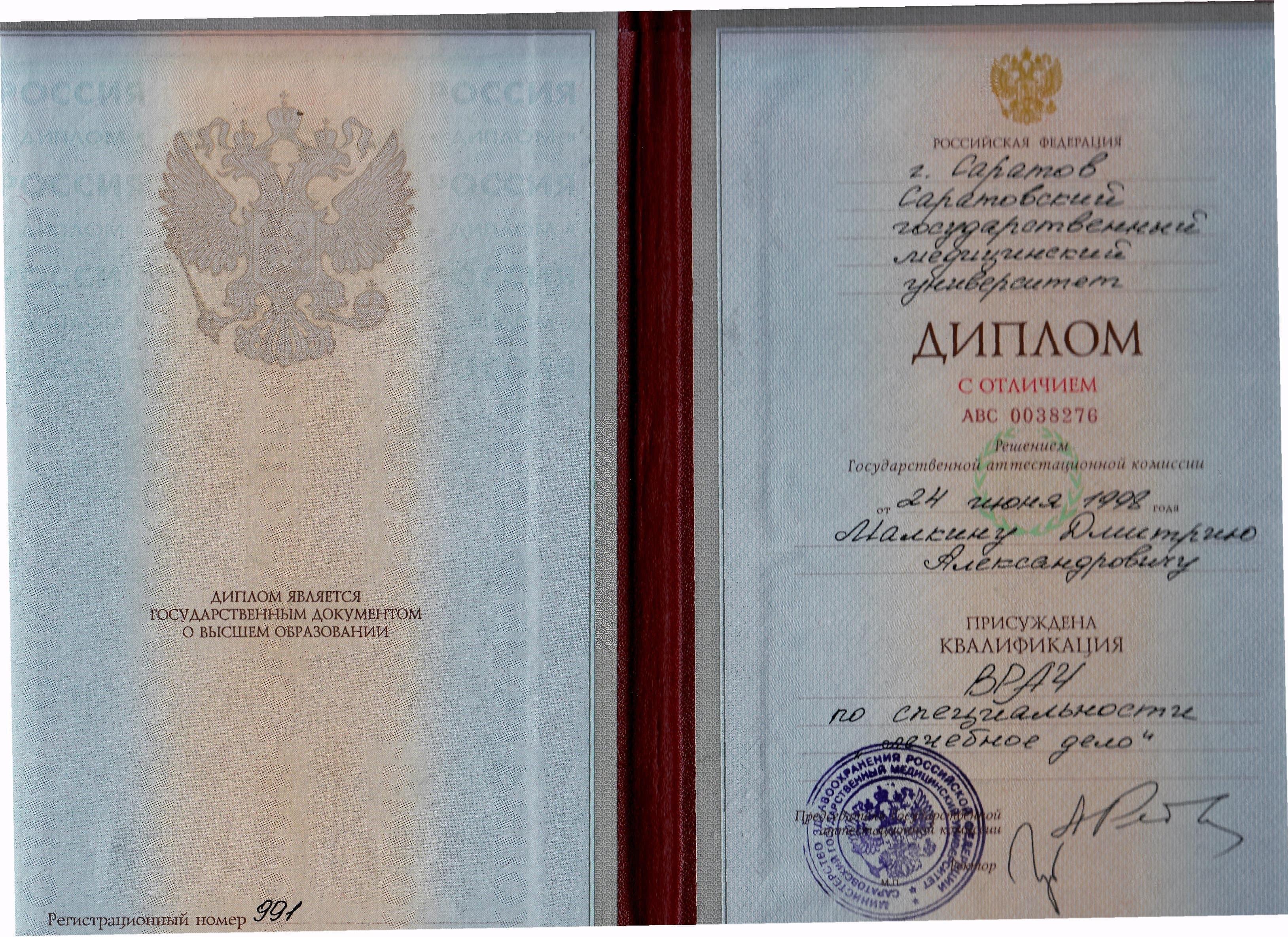 Окончил: Саратовский государственный медицинский университет в 1998г. по специальности врач «лечебное дело».