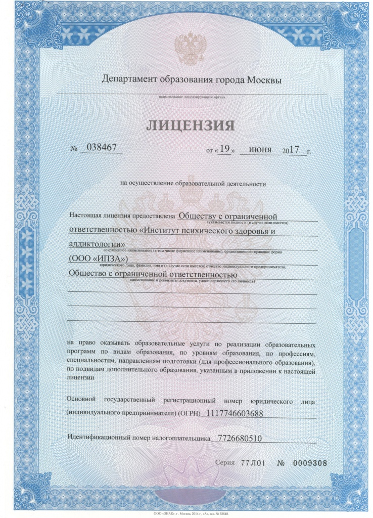 Институт психического здоровья и аддиктологии (ИПЗА) является лечебным и научным учреждением, ведущим образовательную деятельность в сфере дополнительного профессионального образования на основании лицензии Департамента образования г. Москвы № 038467 от 19.06.2017 г.